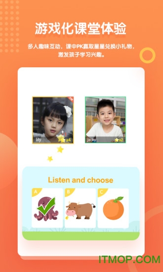 叮咚课堂软件是一款专为5-10岁儿童设计的在线英语学习平台,采用美国CCSS课程标准,由经验丰富的认证美国外教进行小班授课。课程通过趣味互动和游戏化教学,让孩子在轻松愉快的氛围中掌握纯正美式英语。精美的界面设计和流畅的操作体验,让学习过程更加愉悦。