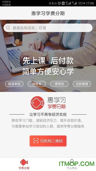 惠学习是一款创新的教育金融服务平台,专注于为学员提供灵活便捷的学费分期解决方案。通过分期支付和贷款服务,我们致力于消除经济障碍,让更多人能够轻松获得优质教育资源,实现个人成长与职业发展。欢迎前往IT猫扑平台下载体验。