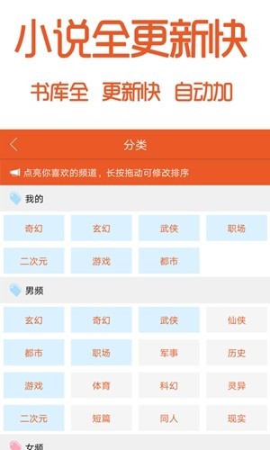 app的作品类型十分的全面,各种热门的题材都一一包含,大家可以点亮感兴趣的标签频道,从而获取更多喜欢的小说资源