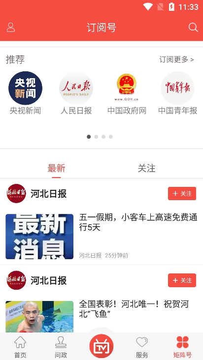 客户端定位"新闻+",分为新闻、政务、服务三大功能板块。
