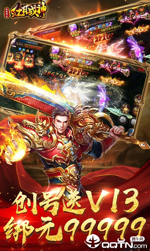 上线赠送vip13,绑定元宝99999,金币1000W