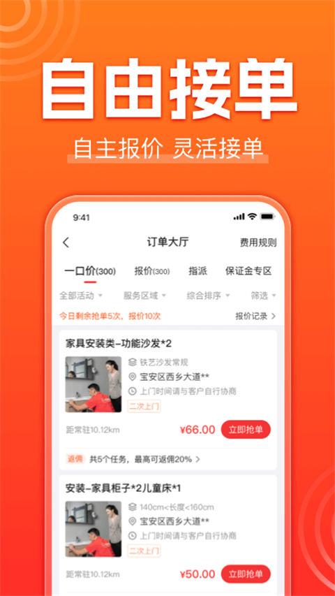 自主报价:师傅自主报价、标准一口价,根据订单信息自由选择。