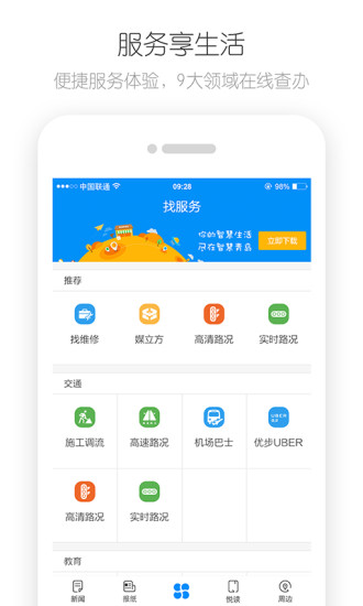 【服务】整合"智慧青岛"APP的城市服务功能,覆盖交通出行、医疗教育、生活缴费等九大领域,实现一站式便民服务。