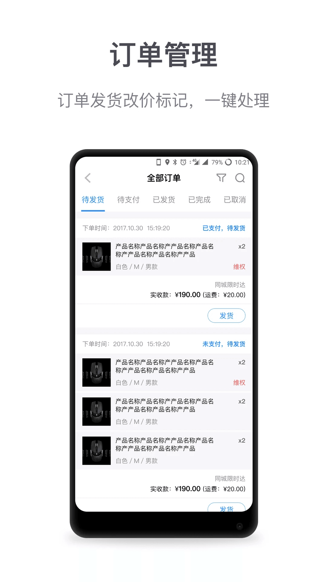 订单管理:对订单进行筛选、发货、改价、标记、取消操作;