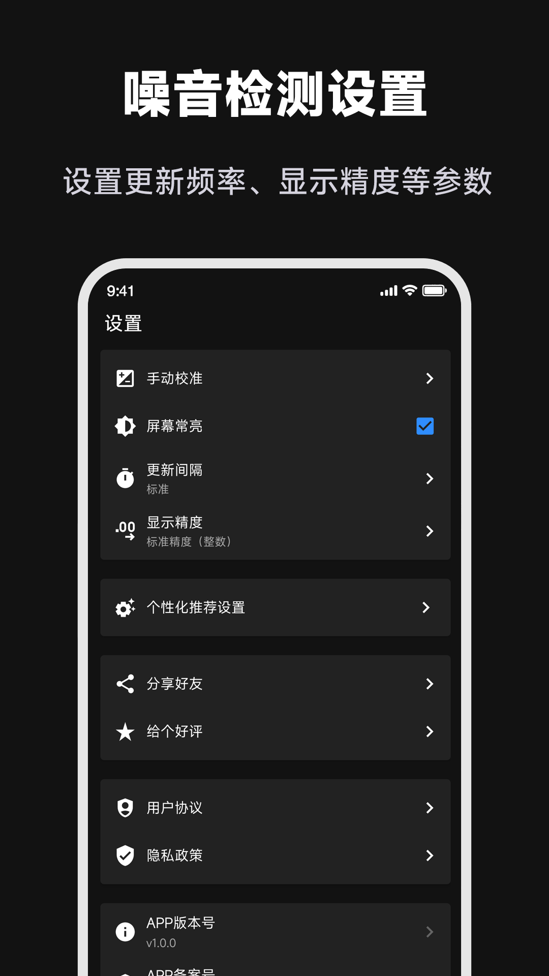 专业准确地测量噪音分贝值,支持手动分贝校准功能