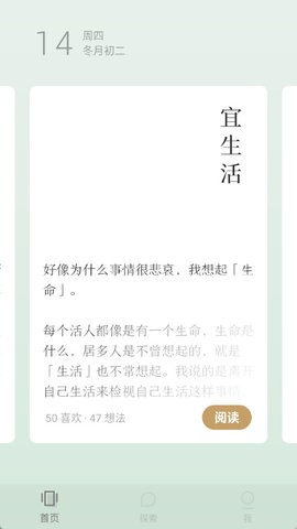 应用底部标签栏有三个一级页面,分别是【首页】、【探索】和【我】。其中,首页是一日一文的推荐,可以滑动查看过往文章;探索是产品将文章以及在文章下发布的用户想法以卡片的形式进行展示。