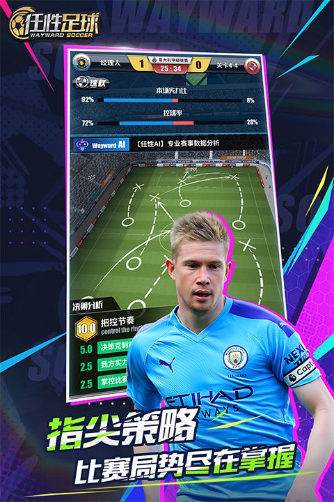 简单易上手的操作方式,专注于战术策略的深度体验。收录众多知名俱乐部现役球星,每位巨星都拥有专属技能。丰富的自定义选项,从球衣装备到战术板设置,打造独一无二的球队风格。