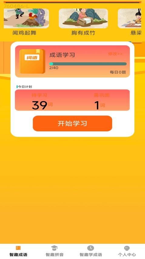 打开智趣成语,在首页,点击开始学习,进入成语学习页。