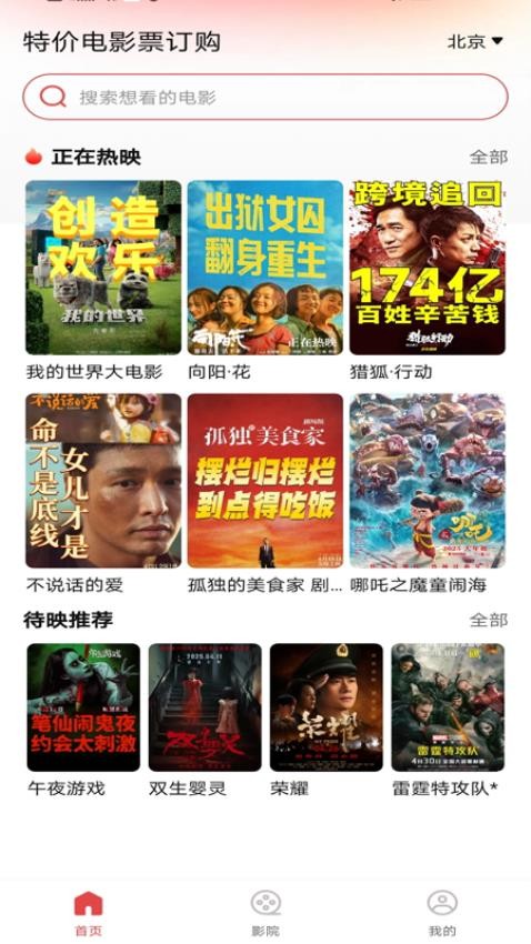 特价电影票订购界面简洁,操作便捷,适合所有电影爱好者。它将热映电影、待映推荐和附近影院等功能相结合,为用户提供了一个全面且实用的观影平台。