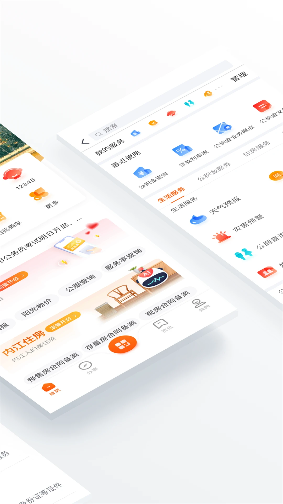 2、城市生活:涵盖市民的教育报名、医疗健康、社区生活、职业人事、住房保障、交通出行、生活缴费、新闻资讯、文化旅游等市民常用服务版块,服务市民生活每一天。