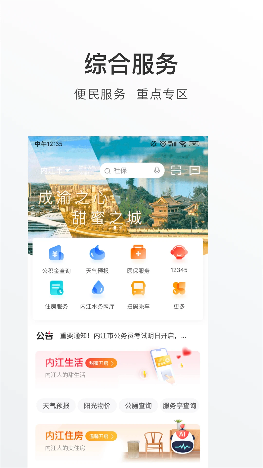 "爱甜城"APP是内江市打造的一款综合性城市服务应用,集政务办事、公共生活、营商服务等功能于一体。作为"数字内江"建设的重要成果,该APP通过整合全市各类服务资源,为市民和企业提供一站式移动服务平台。用户只需一个APP即可享受社保查询、医疗挂号、公交出行、生活缴费等多样化服务,真正实现"一码通城"的便捷体验。无论是个人日常需求还是企业经营事务,"爱甜城"都能提供高效、精准的解决方案,让城市服务触手可及,大大提升了内江市民的生活便利度和幸福感。
