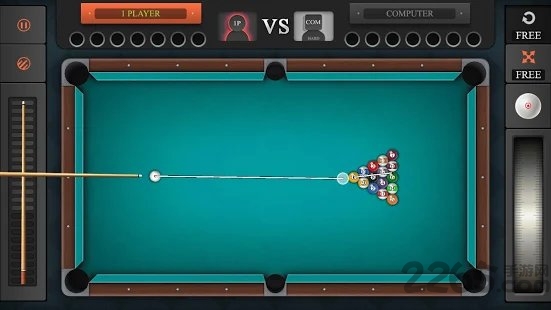 游戏采用标准美式台球规则,1-7号为纯色球,9-15号为条纹球。玩家需要将目标球全部击入袋中,最后打入8号球即可获胜。使用白球精准击打1-15号目标球是制胜关键。