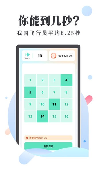 舒尔特方格是全世界范围内公认简单、有效也是科学的注意力训练方法。在规定时间内按顺序从小到大点击数字,所用时间越短,注意力水平越高。