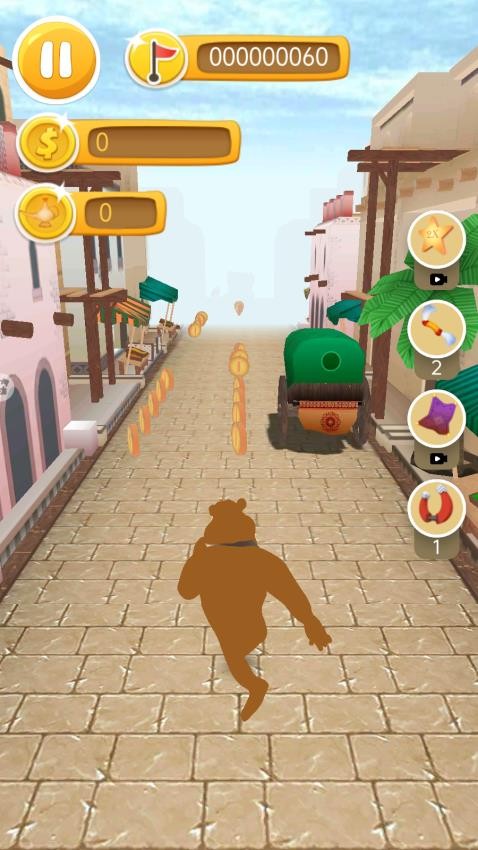 操控这只大熊在场景中持续奔跑,避开障碍物,并收集金币。