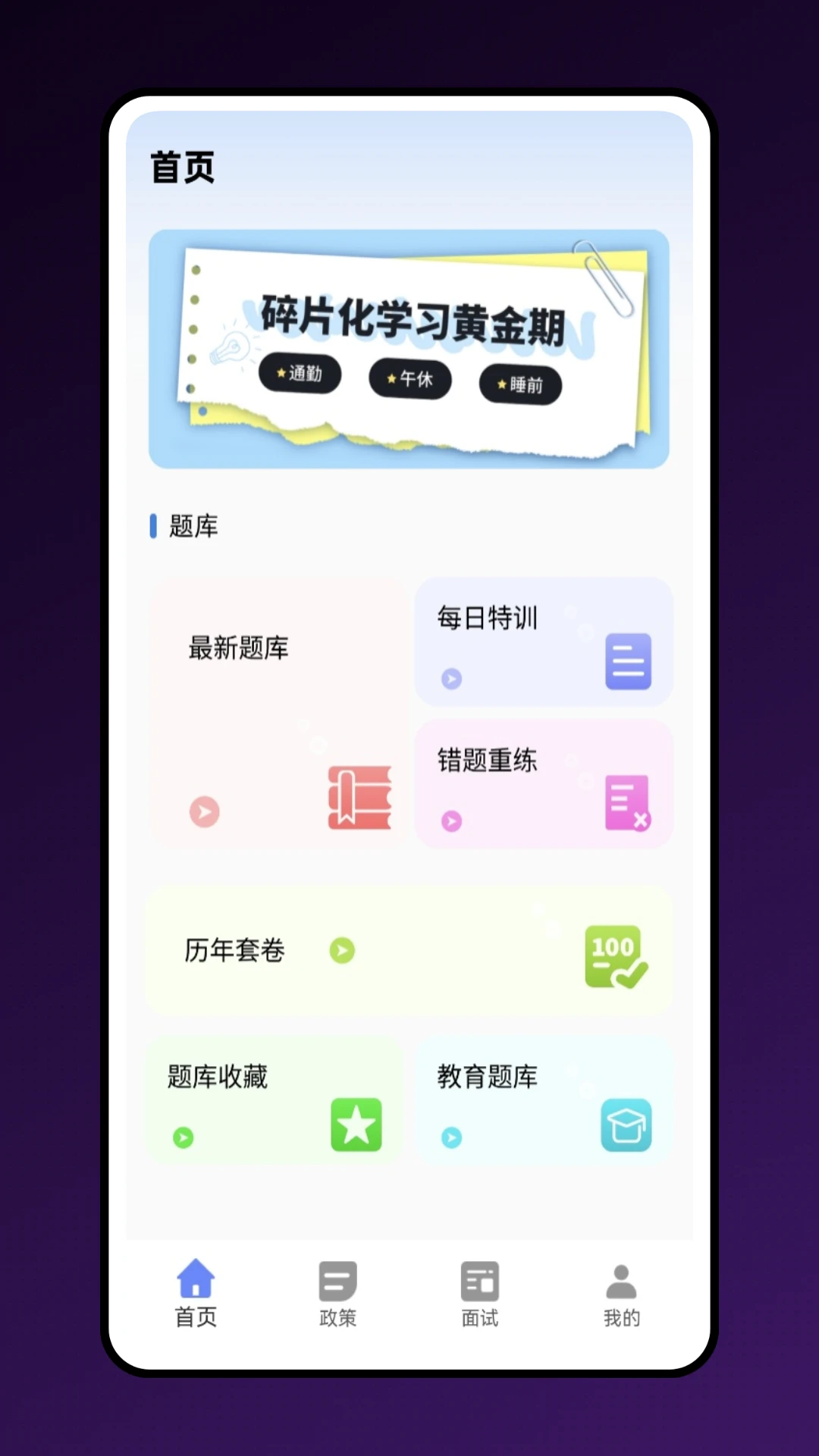 想高效备考公务员考试?这就是你的专属利器!海量真题全面覆盖,行测、申论等题型应有尽有,历年套卷随时刷,精准把握考试脉络。每日特训助力日常积累,错题重练专攻薄弱环节,碎片时间也能化身学习黄金期,通勤、午休、睡前都能刷题提分。不仅有笔试干货,面试指导也超贴心!面试技巧、现场模拟分享,从自我介绍到答题全流程,帮你克服面试紧张,轻松应对考官。政策资讯实时更新,买房、买车、养老、上学等地方政策一键查询,备考之余也能掌握生活实用信息。无论你是公考小白还是冲刺选手,APP陪你一路闯关,成功上岸!
