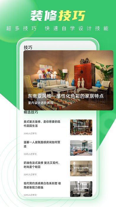 汇集海量房屋装修知识,让您的居所焕发全新魅力!特别适合初次装修的年轻人使用。平台汇聚了众多优秀家居设计师,展示他们的创意作品和购物清单,方便用户参考借鉴。首页精选设计师作品展示,点击图片可查看详情,支持收藏、转发及与设计师互动等功能。