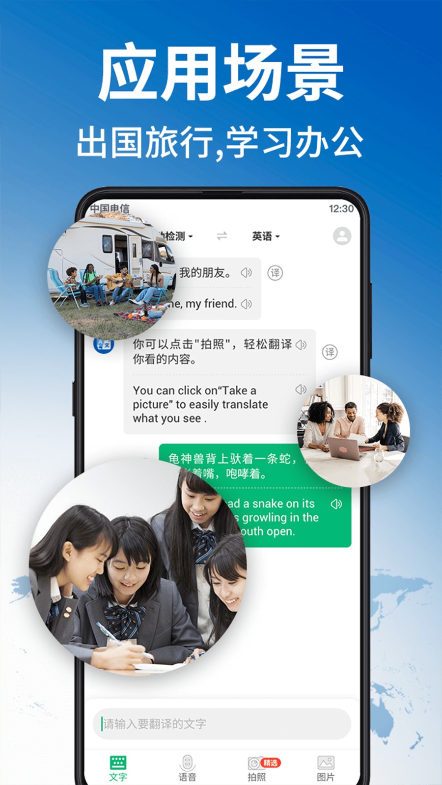 提供拍照翻译功能,支持对图片、菜单、文件等内容进行文字识别与翻译。
