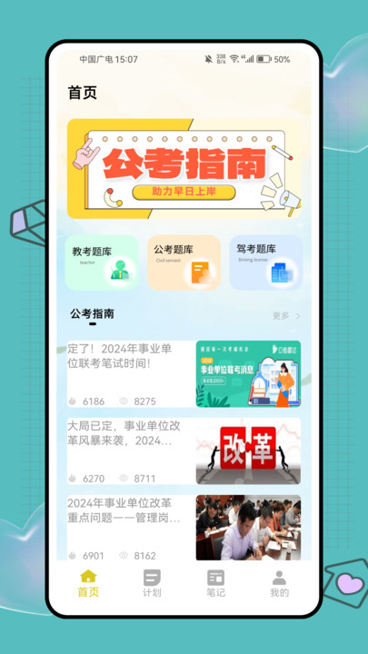 进入首页可以看到丰富的功能,多种备考题库任你选择。