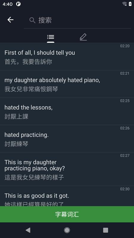 ・中英文字幕切换、字幕预览/查找、字幕词汇分析、添加笔记、收藏句子、上一句/下一句字幕跳转、单句字幕循环播放、无级变速播放、屏幕查词、离线下载视频、导出音频和字幕、加载手机本地存储卡的视频/字幕..
