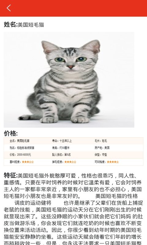 完整呈现宠物各项特征参数:市场价格、平均寿命、体型大小、生活习性、原产地、智商水平、性格特点、毛发护理、饮食偏好等。