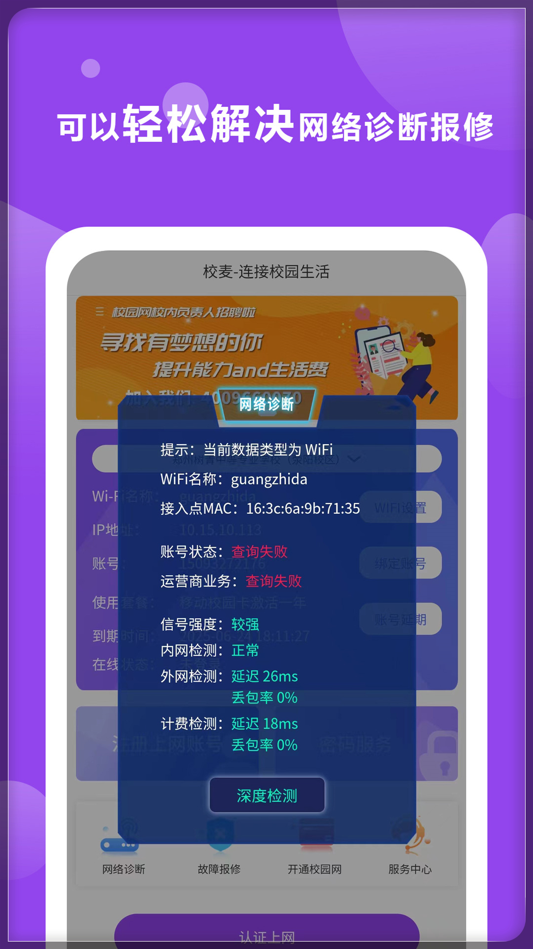 校麦APP是一款应用于校园无线网络快速认证及故障处理帮助,