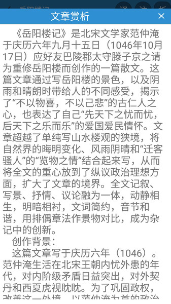 软件采用典雅的古风设计,还原了传统书籍的厚重质感,营造出沉浸式的学习氛围。内容涵盖各类题材的经典古文,每篇都配有精准的现代文翻译、详细注释和赏析解读,帮助用户深入理解文言文的内涵与运用。