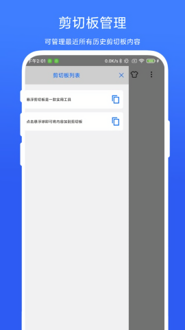 使用简单,支持剪切板历史记录查看双击显示剪切板弹框,让手机操作更省心;