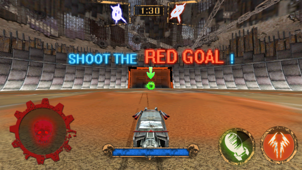 简单的游戏操作:拖移左下角模拟摇杆控制赛车移动;使用装备按钮攻击敌人或防御,限定时间内将足球撞击入门框多者即胜利,当然把对手撞成废铁也未尝不可。