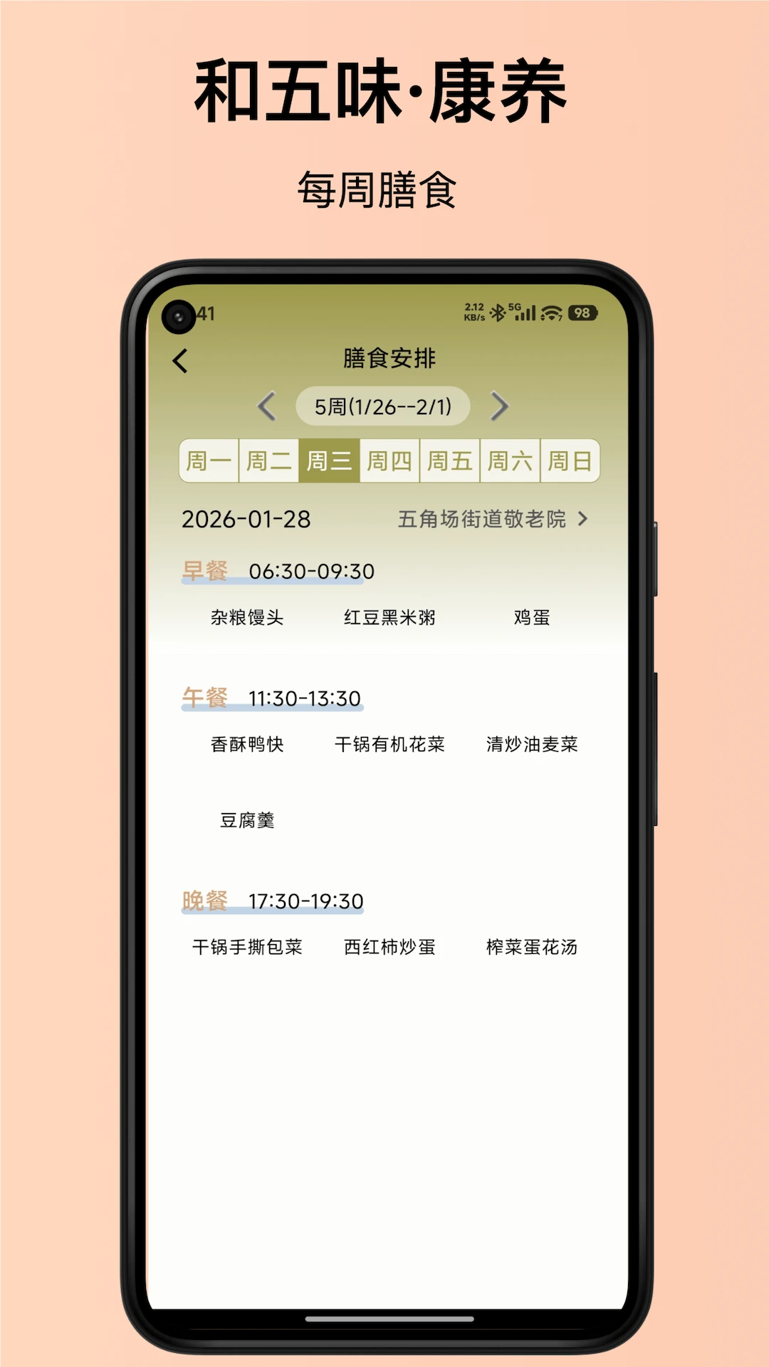 可视化饮食管理:展示每周营养食谱,特殊饮食需求标注,支持查看每餐实际用餐照片