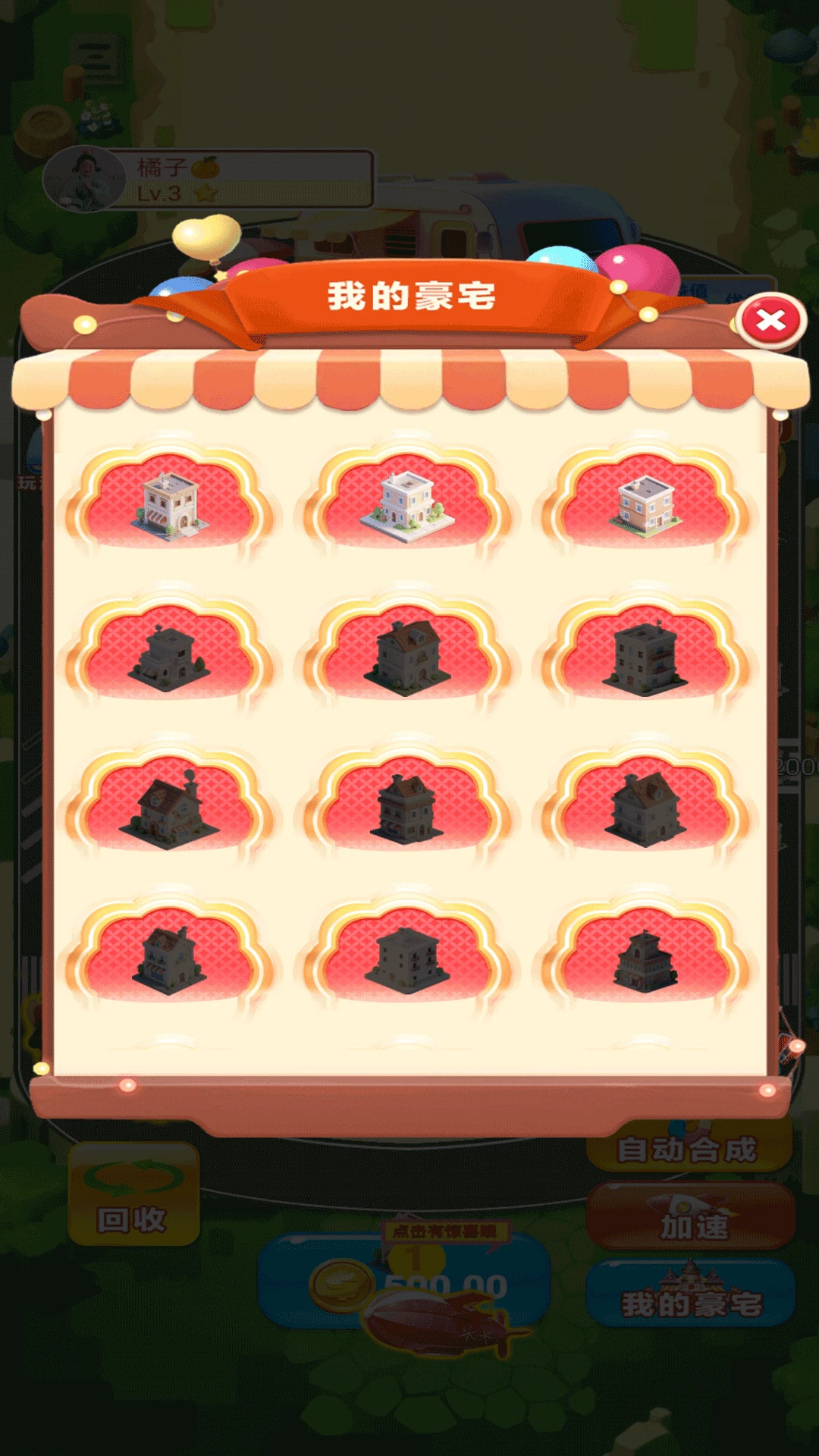 合成升级系统:通过拖拽相同等级的房子进行合并,解锁更高级的建筑,体验从茅草屋到摩天大楼的成长乐趣。