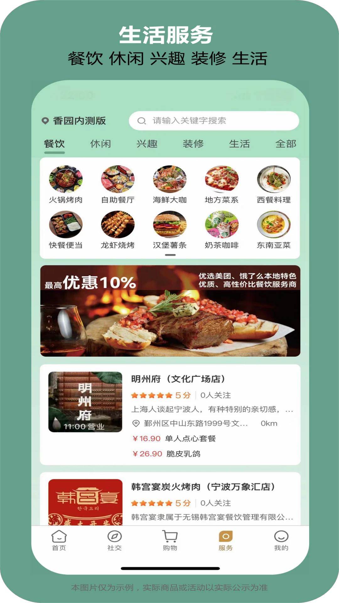 餐饮美食、丽人休闲、兴趣教育、家居装潢、生活服务