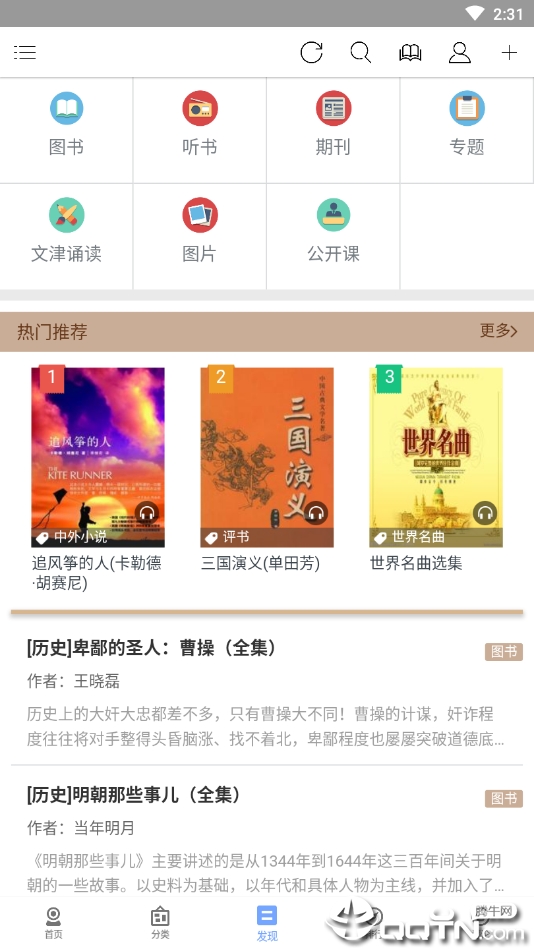 阅读内容包括:出版的各类图书、短文章、长文章、报纸、期刊、提供、名著作品的源文件下载,和听书资源、讲解资源。