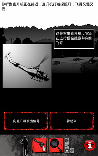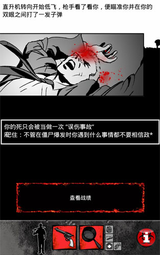 游戏采用独特的美式漫画风格,以黑白为主色调,搭配醒目的红色点缀,营造出压抑而紧张的末日氛围。唯一出现彩色画面的"最终结局"界面,往往意味着游戏结束,这反而成为玩家最不愿看到的画面。这种视觉设计巧妙地强化了生存挑战的紧迫感。