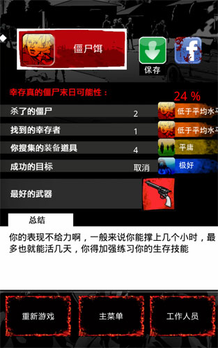 建议优先探索警察局获取武器装备。组建3人小队并配备战术霰弹枪后,生存几率将大幅提升。在确保安全的前提下,尽可能招募更多幸存者,收集各类物资。通过多次尝试,玩家可以掌握最佳生存策略。当达成击杀20个僵尸、保全10名队友、收集11件物品等条件后,无论是选择隐居山林还是固守乡村,都能获得99%的生存概率。