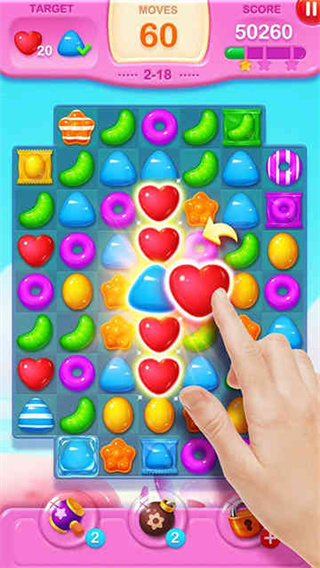 有着各种各样的糖果外观设计,玩家能够享受滑动不同的糖果在关卡中让糖果都消失,非常的好玩。