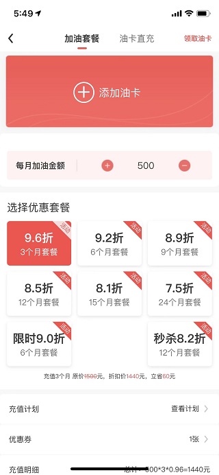 用户可以选择套餐充值或者油卡直冲两种方式为油卡进行充值