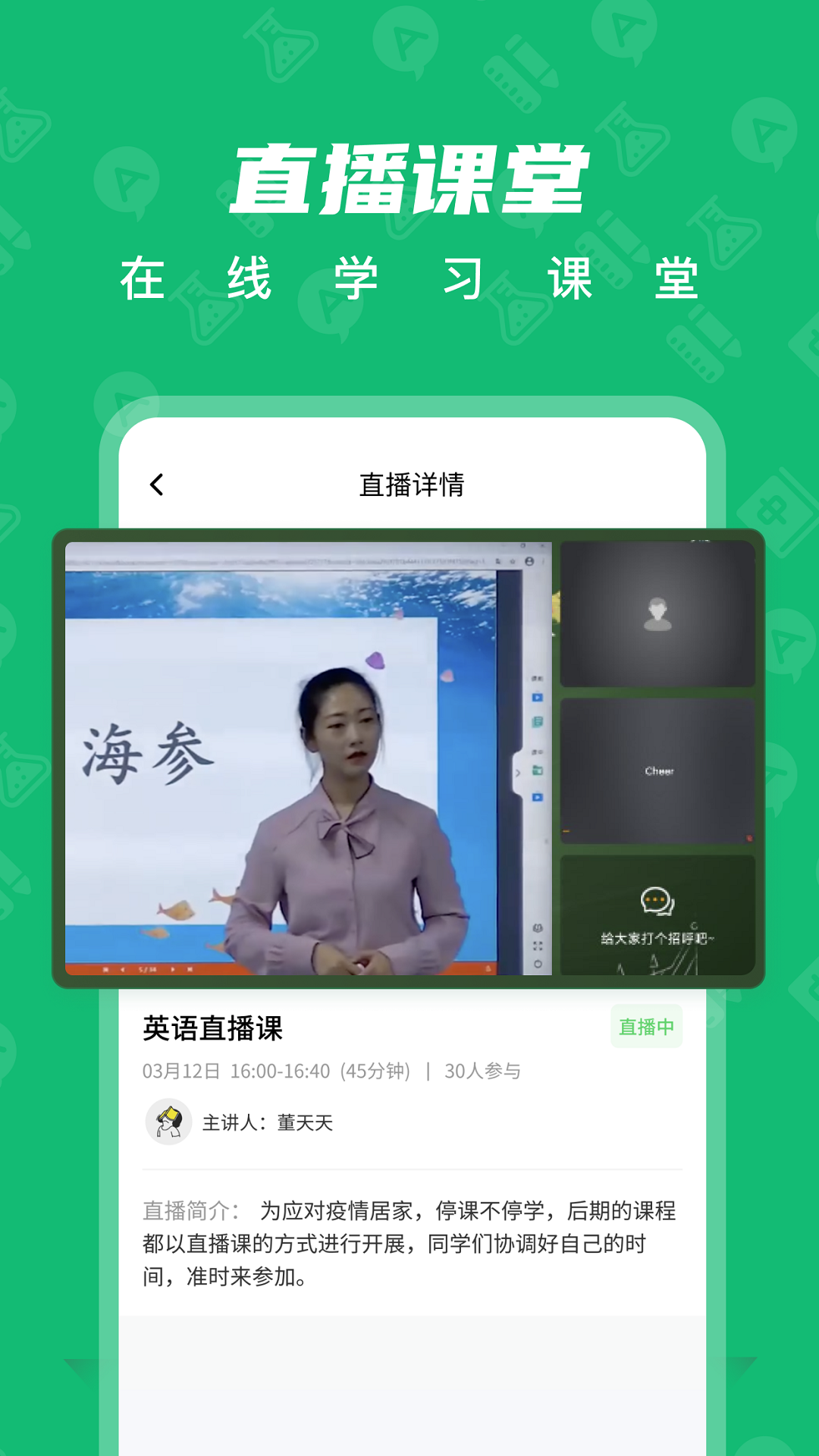 学生能在线参加老师组织的直播课程,支持直播互动,模拟线下真实上课情景