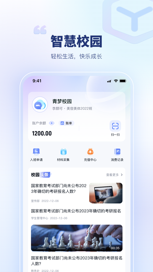 青梦校园app整合了从招生到教学的全流程管理功能,涵盖学生管理、学校运营等多个维度。该平台提供线上缴费、校园一卡通等实用功能,显著提升了师生的工作和学习效率。同时,还设有社交互动板块,让用户在学习工作之余能够分享校园生活点滴。