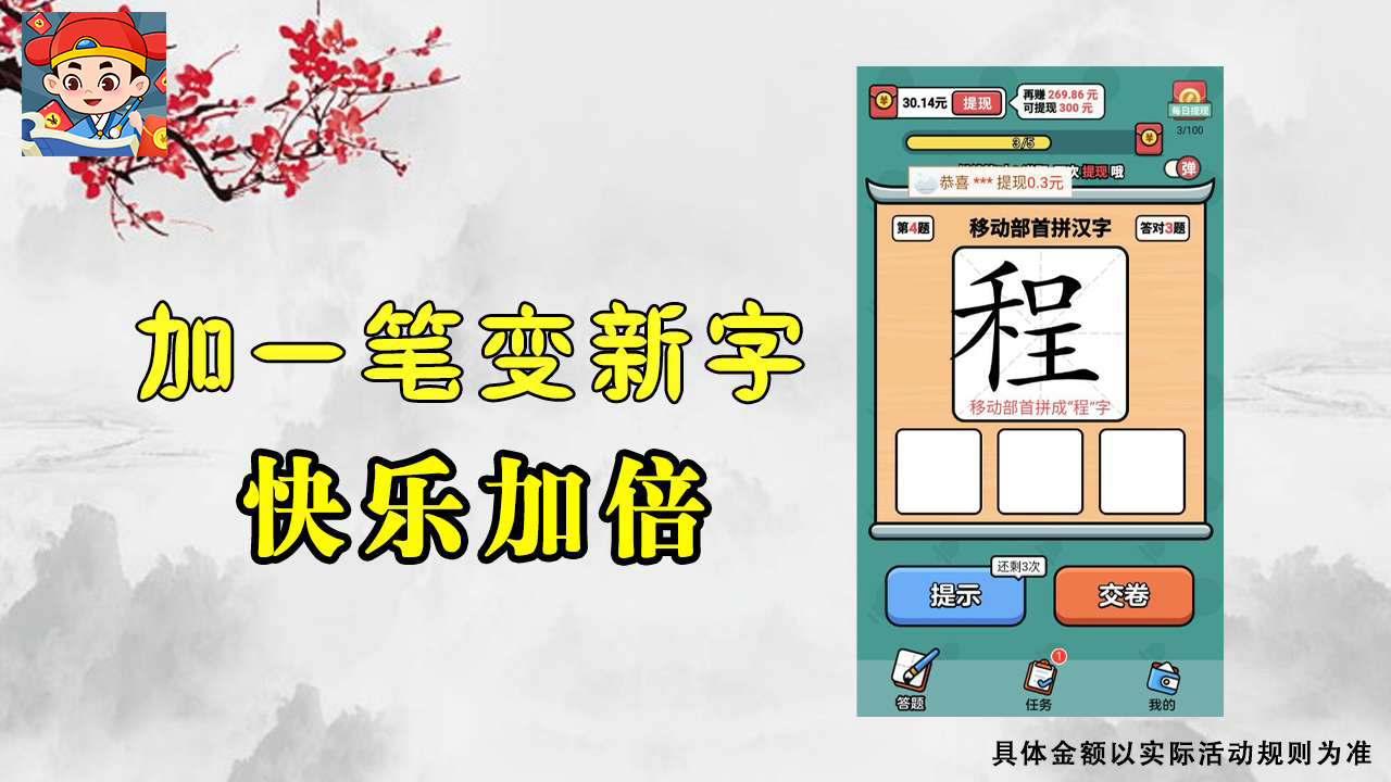 汉字大神是一款创意十足的手游,无需实名认证和绑定银行卡,玩家只需通过猜字游戏即可赢取丰厚奖励,奖励支持实时提现。新用户注册即赠红包,游戏玩法简单有趣,只需在原有汉字上添加一笔即可形成新字。