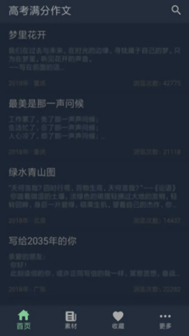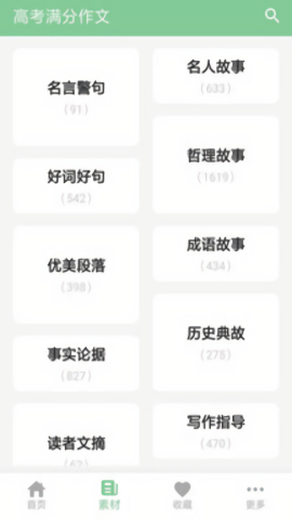 全国高考范文:完整收录31个省市自治区的高考满分作文。写作素材库:包含写作指导、名言警句、名人故事、哲理故事等十余个子分类,提供全方位写作支持。个人收藏:支持一键收藏优秀文章,建立个性化学习资料库。