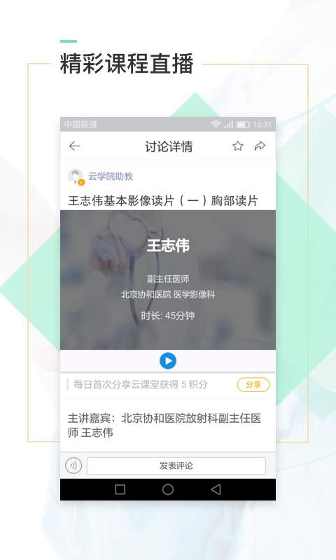 医口袋可以让用户行医更加轻松,有精彩的医学课程直播,帮助用户更加高效的学医,摆脱空间和环境的束缚