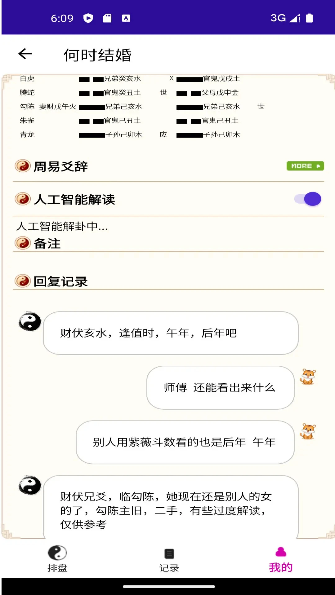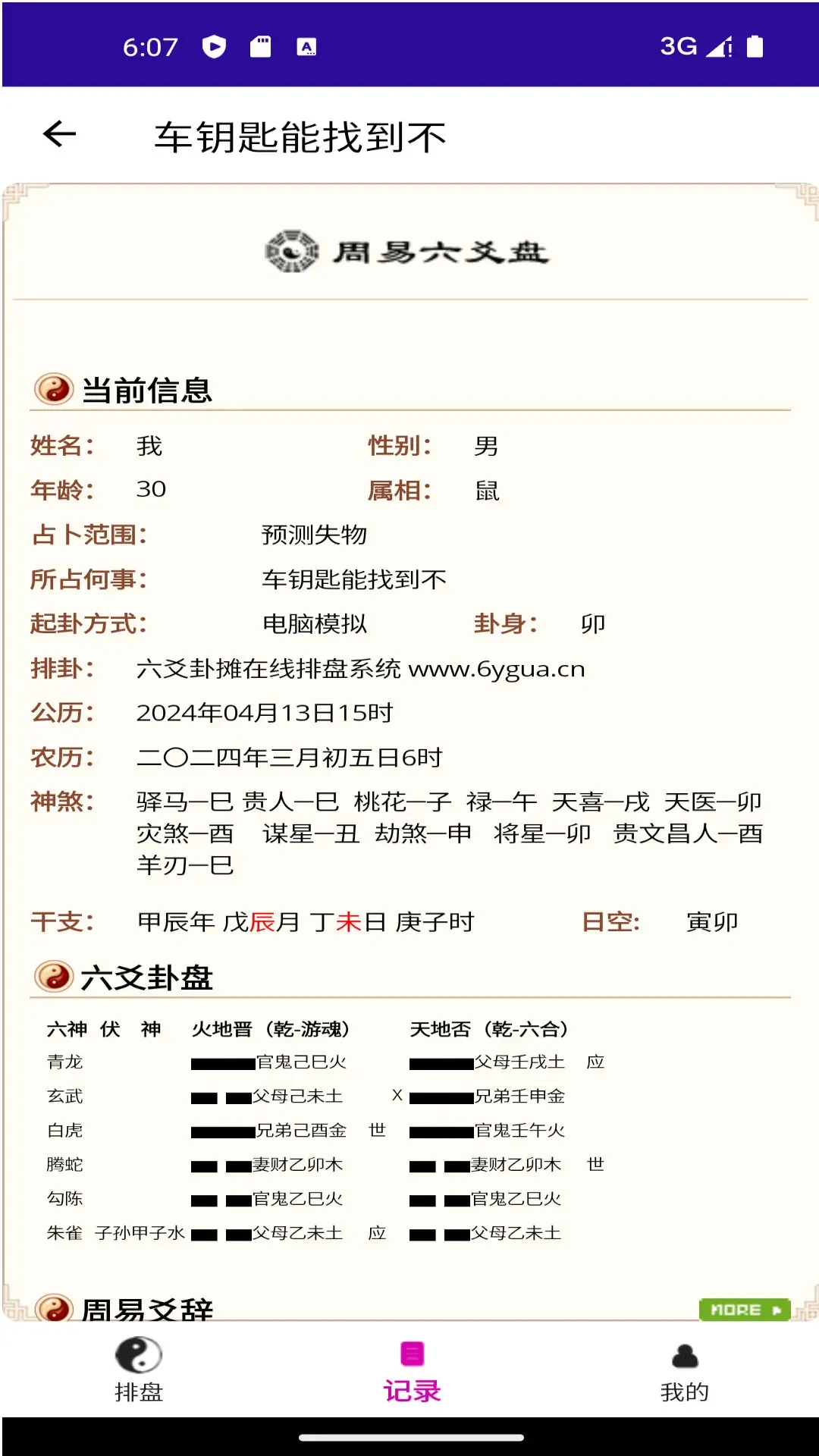 智能六爻排盘:支持手动或自动起卦,提供标准六爻排盘界面,自动生成卦象、爻位和变卦信息。