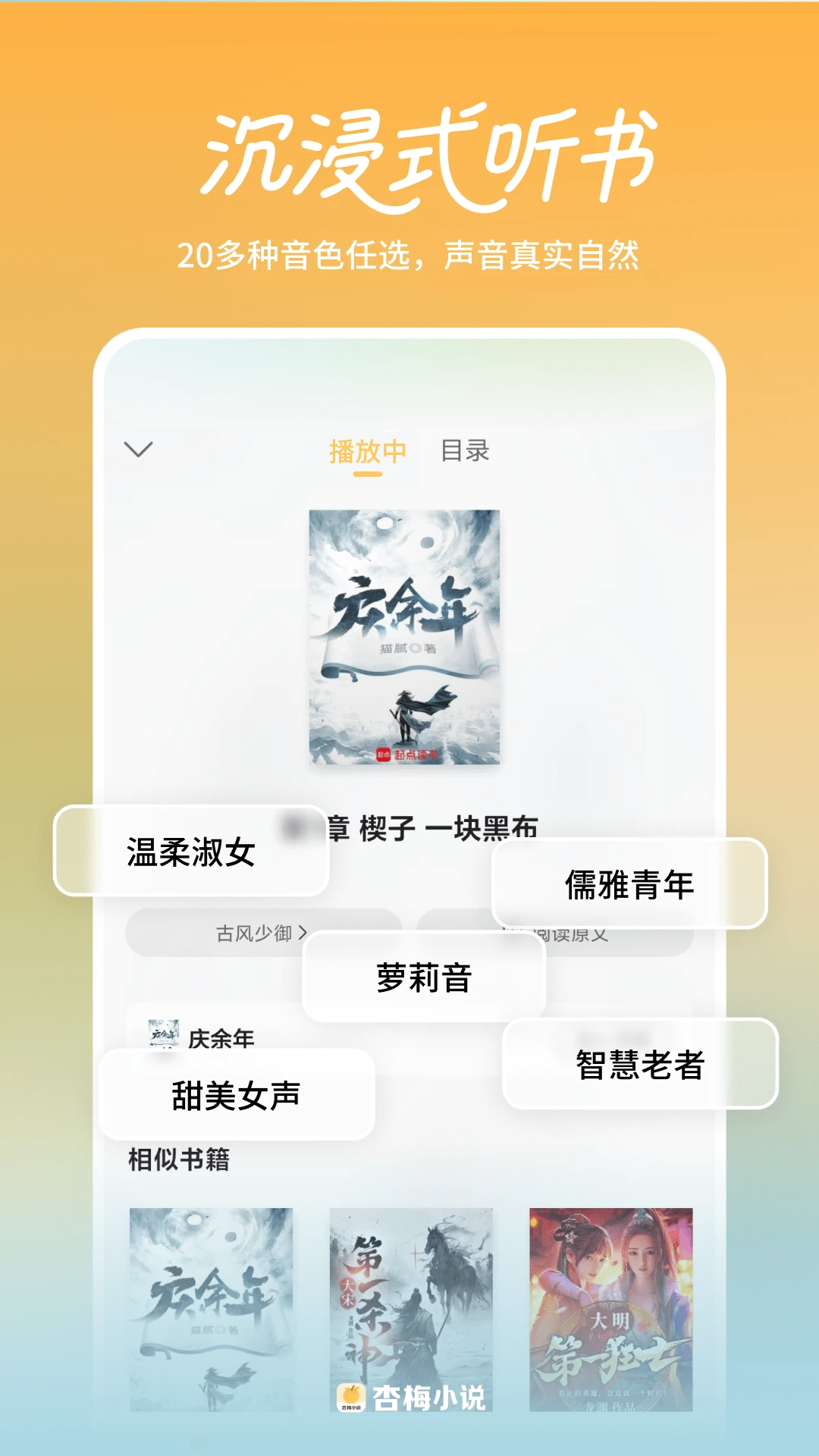 【20种音色随心听】舒适音色和方言音色效果真实自然,畅享近乎真人讲书般的听觉盛宴。