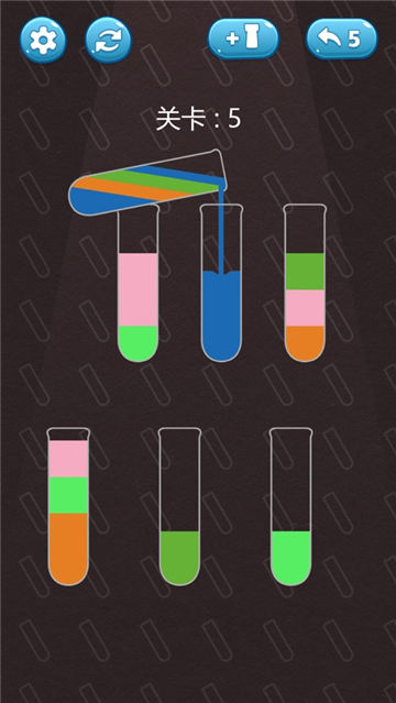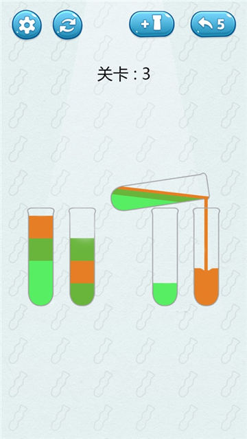这个游戏里装在瓶子里的沙粒不同颜色,只有相同颜色的沙粒可以融合。