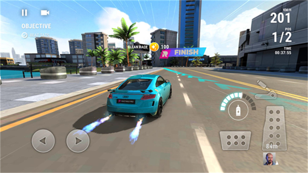 启动游戏后点击屏幕进入主界面,选择适合的操控方式。新手教程将引导玩家熟悉赛车操作,左侧控制方向,右侧负责油门、刹车和氮气加速。率先冲过终点可获得经验值和游戏货币,用于解锁更多高性能赛车。