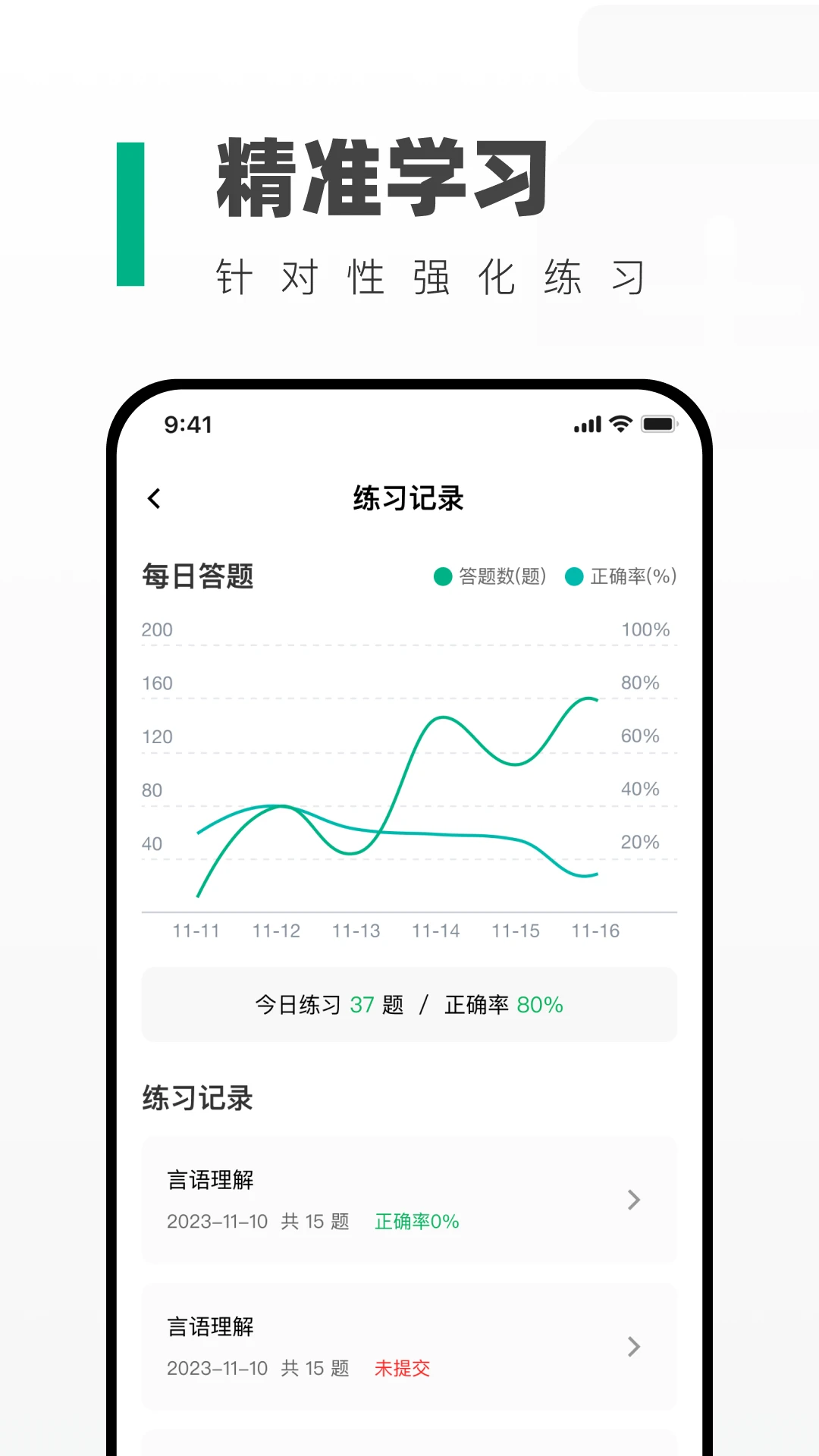 实时记录刷题数据,可视化展示正确率变化曲线,智能推荐待强化知识点,让备考进度一目了然。