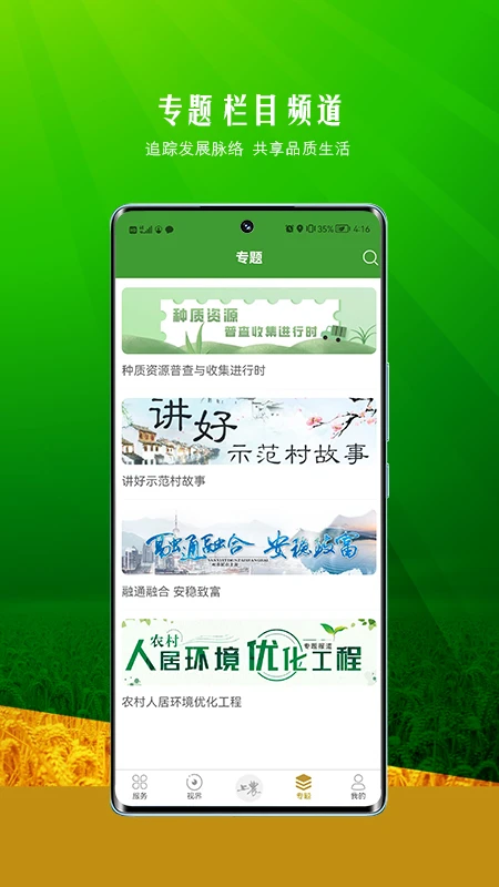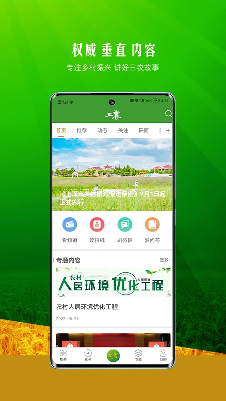 上农是由东方城乡报社精心打造的一款专注于上海农业农村领域的综合性信息平台,作为上海市农业农村委员会指定的官方信息发布载体,它集新闻资讯、便民服务和情感共鸣于一体。通过上农,用户可以深入了解上海乡村振兴的进程和都市现代绿色农业的发展动态,同时也能领略到上海独特的风物人情和浓厚的乡土情怀。无论是身居繁华都市的市民,还是心系家乡的游子,都能在这里找到属于自己的那份乡愁与感动。