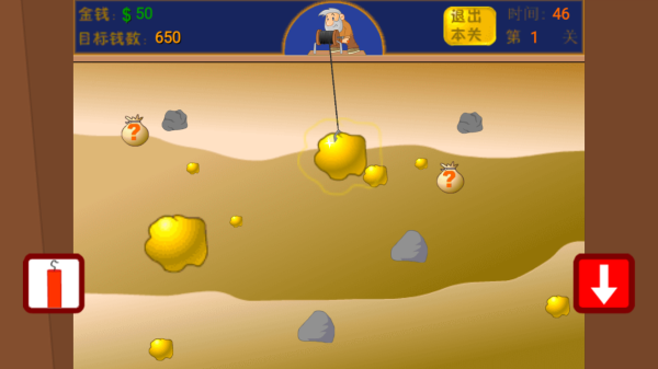 操作简单,在钩子摇摆的过程中,瞄准金子,点击屏幕时即会释出钩去抓取金子。
