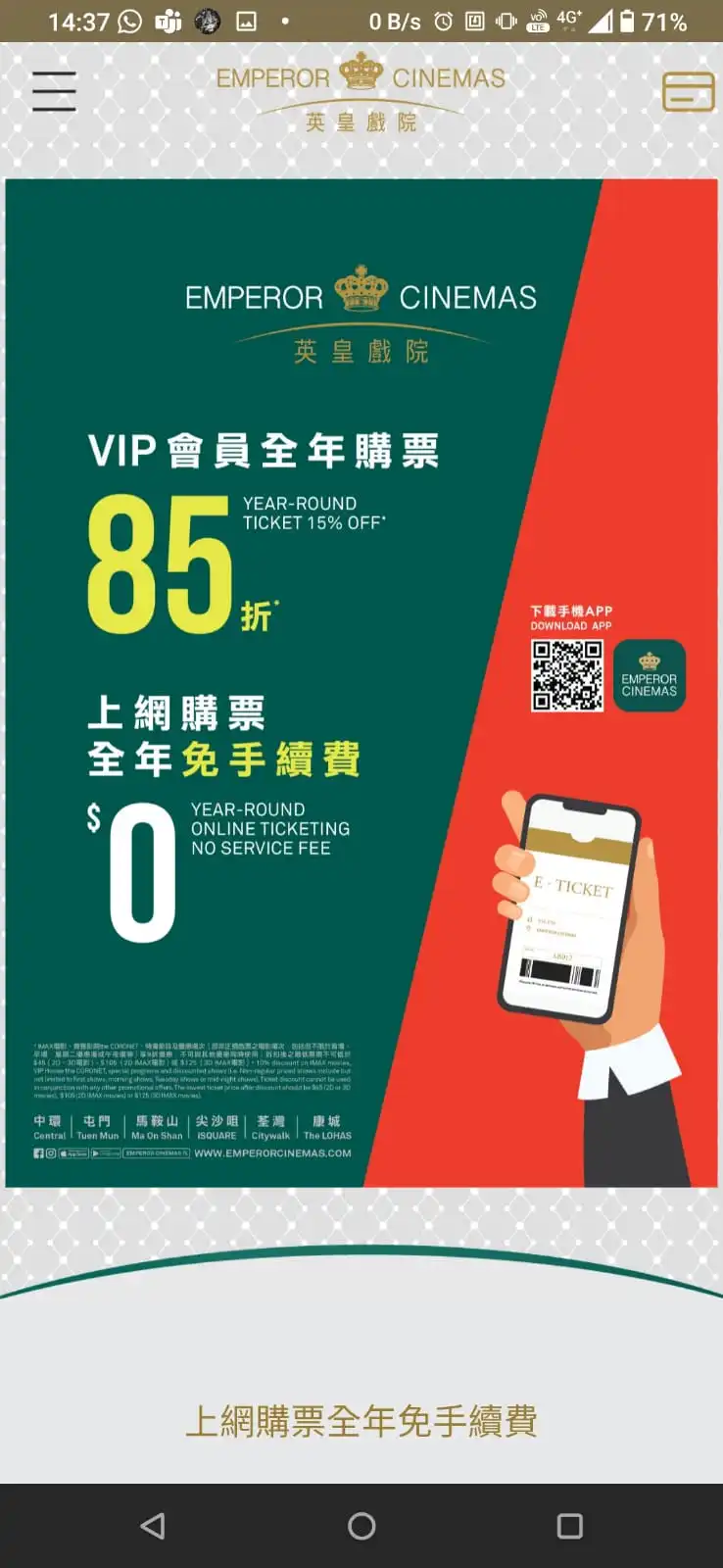 此版本采用全新UI/UX设计,带来更流畅、更优质的购票体验。免费CINEMER会员新增专属礼遇:全年线上购票,免服务费,每次购票均可收集印章兑换现金折扣。