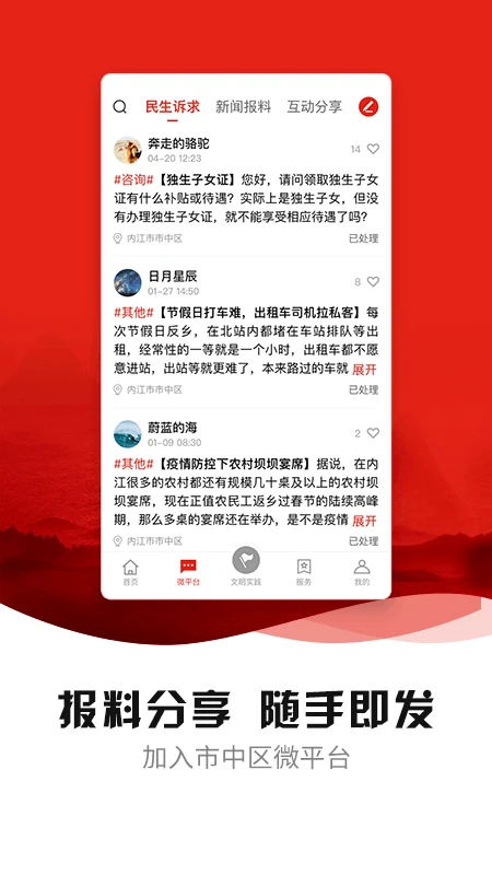 中区融媒APP是内江市中区官方打造的综合性新闻资讯平台,集新闻发布、政务公开、便民服务、互动交流于一体,为用户提供权威、及时、全面的本地资讯。作为内江市中区的官方客户端,中区融媒APP不仅涵盖了政治、经济、文化、社会等各领域的新闻报道,还整合了政务服务功能,让市民足不出户即可办理各类事务。通过这款APP,用户可以第一时间获取中区最新动态,参与社区互动,享受便捷的数字化生活服务。